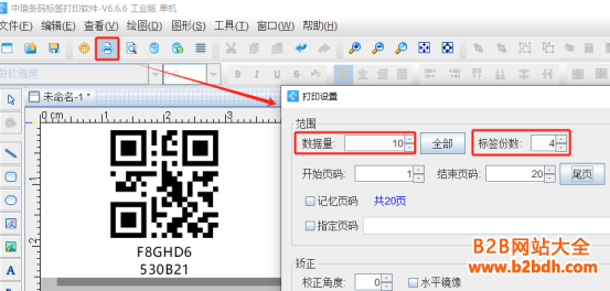 4.点击软件顶部的“打印”按钮,设置数据量(标签总个数)、标签份数(每个标签重复打印的个数)设置为4,开始页码(从那一页开始打印)、结束页码(到那一页结束打印),打印到切换到“打印机”,点击下面的“打印”按钮,软件中会出现一个输入提示框,用扫码枪将已有的二维码内容扫描进去之后,打印机中就会即时打印出来4个相同内容的二维码标签,直到最后一个二维码扫描完成之后,输入提示框就自动消失了。